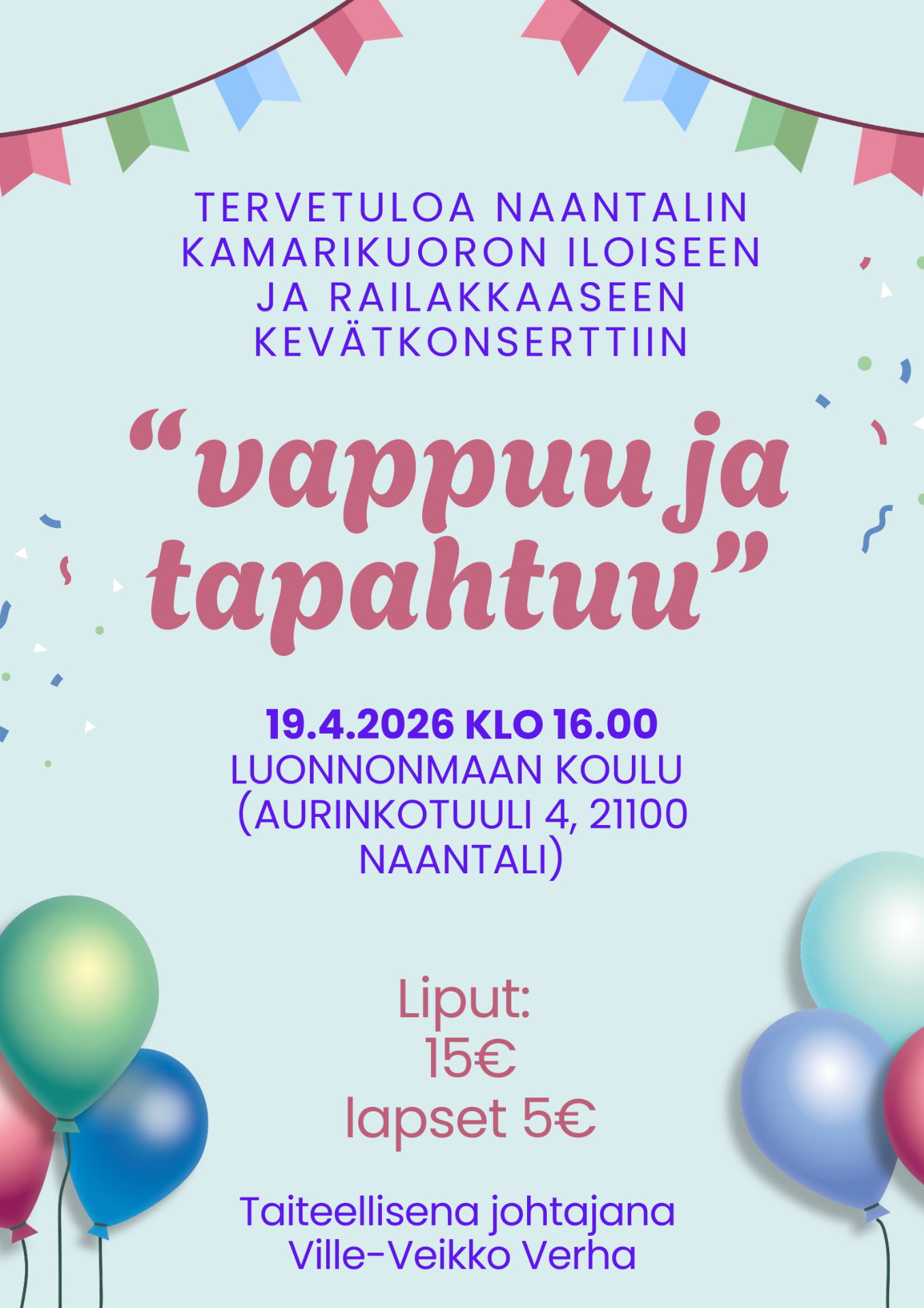 " Vappuu ja tapahtuu" on iloinen konserttitapahtuma ennen virallista vappua. Tempaudu mukaan kevääseen! Paikan päällä myös arvonta sekä donitsi ja sima myyntiä!